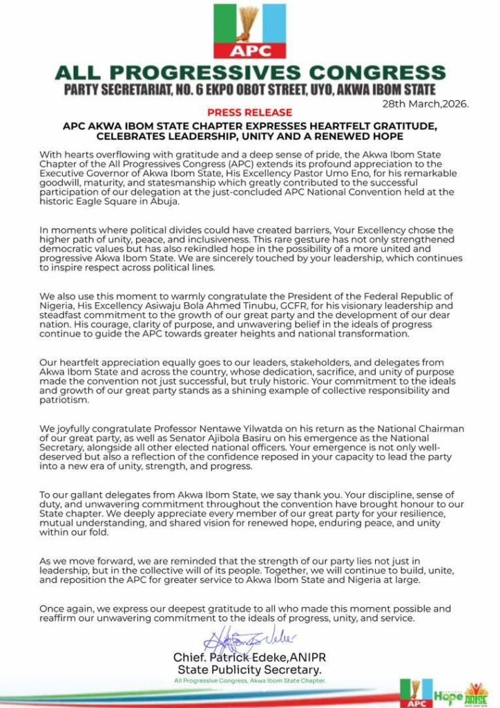 With hearts overflowing with gratitude and a deep sense of pride, the Akwa Ibom State Chapter of the All Progressives Congress (APC) extends its profound appreciation to the Executive Governor of Akwa Ibom State, His Excellency Pastor Umo Eno, for his remarkable goodwill, maturity, and statesmanship which greatly contributed to the successful participation of our delegation at the just-concluded APC National Convention held at the historic Eagle Square in Abuja.